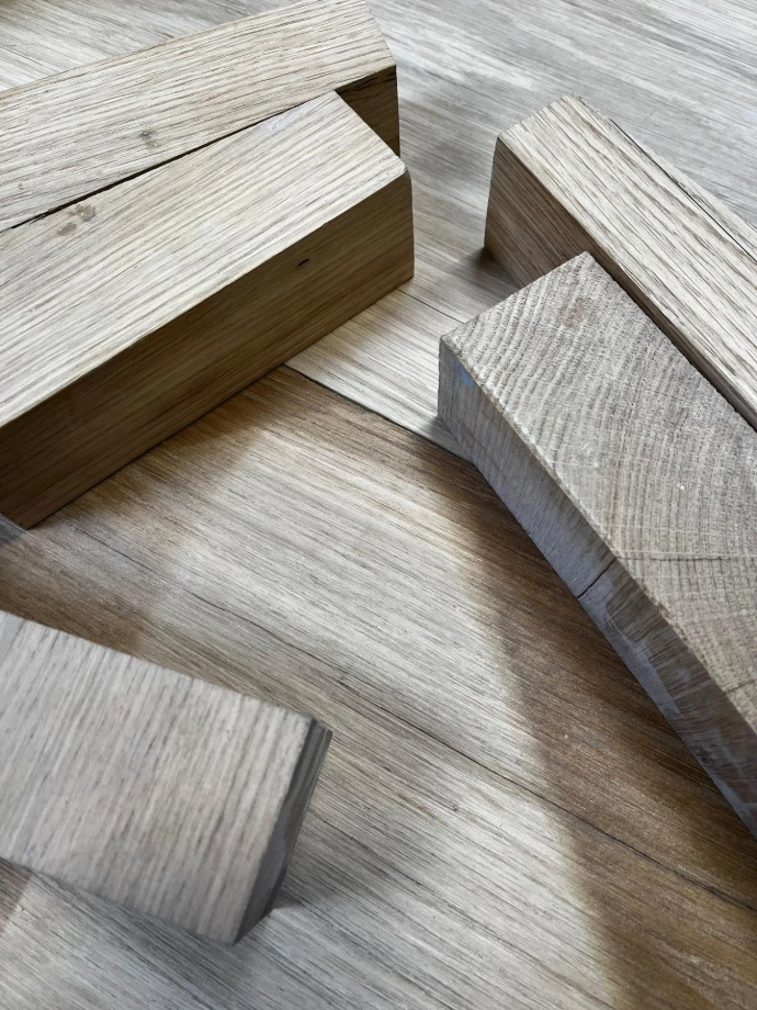Issus de déconstruction, chantiers et filières de réemploi, remis à dimension, stabilisés et réassemblés pour créer des pièces chaleureuses et durables.